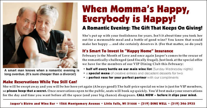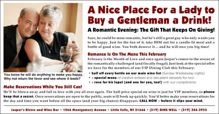 I really couldn't figure out what the offer from the restaurant in Cyprus was all about, so for purposes of illustration I opted to create promotional pieces for a month-long offer in February for the imaginary Jasper's Bistro and Wine Bar.