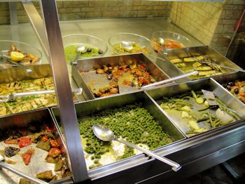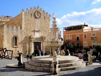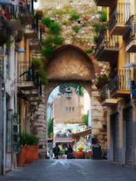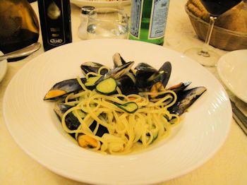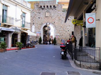 We had lunch at Ristorante Tiramisu, an unpretentious restaurant just outside Porta Messina at one end of the main pedestrian street. This was the first time I have followed a recommendation from Lonely Planet and it was spot on. My linguini cozze, menta e zucchine (linguini with mussels, mint and sliced zucchini) was a delightful combination of flavors. Margene went for a Sicilian classic: rigatone alla Norma (pasta with tomato, eggplant, basil and a salty ricotta cheese). She's still smiling about it days later.