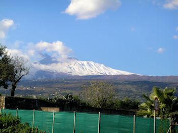 Breakfast was a ricotta-filled pastry and cappuccino in Bar Siempre Noi, a little spot Marina recommended. There wasn't much in the way of agmosphere, but the products and the people were very warm and user-friendly. Mt. Etna erupted again today. Nothing explosive like Mount St. Helens, but it will shower the area with sand-like black pumice. We took the back roads north in weather that was temperate but rather strange -- clear and sunny sometimes and quite overcast at others. Perhaps that is an effect created by the mountain (which was mostly behind the clouds). We did manage to catch a shot of it during a brief weather break. Glad we were in a spot with a sight line to the peak.