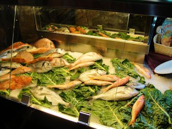 Dinner starts with a trip to the antipasti bar where you have an array of close to twenty preparations of various vegetables, all painfully fresh and prepared in-house. Then the Primi (pasta course) -- in our case two spaghetti preparations, one with clams and one with mussels. I asked Marina what would make a dish like this Sicilian as opposed to the same recipe prepared elsewhere. She said the local seafood has a distinctive taste because it comes from waters exposed to a high level of lava and volcanic ash. Since Italians typically only cook with ingredients that can be sourced locally, Sicilian ingredients are not available elsewhere.