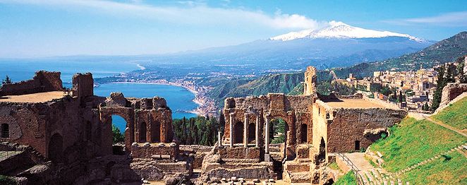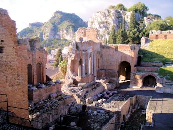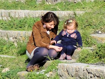 Taormina's Teatro Greco (Greek Theater) is a near-perfect ancient amphitheater originally built in the 3rd century BC and the second largest in Sicily. Only the theater in Siracusa is bigger (but certainly doesn't have as dramatic a site. I borrowed a couple of pictures to show you what we would have seen had Etna not been acting up. Up in the seating area, I caught a little slice of life -- a mother and daughter sharing a small learning lesson. (Dad was moving around the perimeter snapping photos through a long lens.