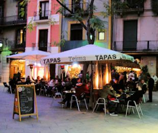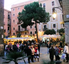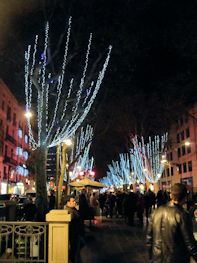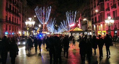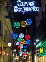 So we found a couple of spots for late afternoon tapas, had a frosty beverage in a table on La Rambla and just became temporary city denizens waiting for it to get dark enough for the Christmas lights to come on. There was a nice little Christmas market going on in Piazza del Pi, quite a change of scene from our rainy day visit a few days ago. It seems that Barcelona is determined to live outside as long as possible. In the summer, al fresco dining is a no-brainer. In the winter, it involves lots of propane heaters!