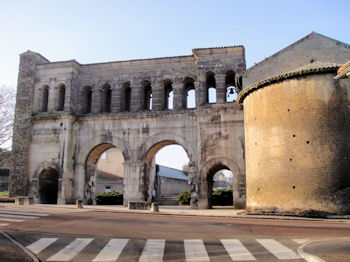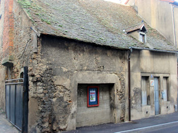 In a reverse of what we experienced going to Semur, we suddenly drove OUT of the fog and into a sunny sky. We drove past what passed for a street market today (three stalls selling coats!) and kept going. Here is a photo of one of the two remaining Roman gates ... along with an old building across the street that just looked cool. It looks like there might be a real story attached to it, like what was the low doorway (long ago walled over) originally for? I wonder about these things.