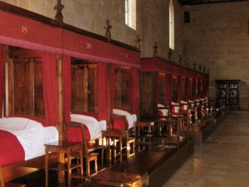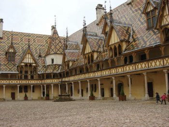 The Hotel Dieu in Beaune was a 15th century charity hospital. The courtyard has the Burgundian tile roofs. The beds in the main hall were each occupied by two patients and tended by nuns. All this was a very advanced concept for its day ... although the medical practices of the time were still very medieval. You don't even want to think about the implements that the doctors used to treat disease.
