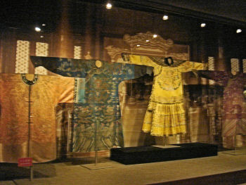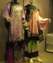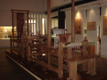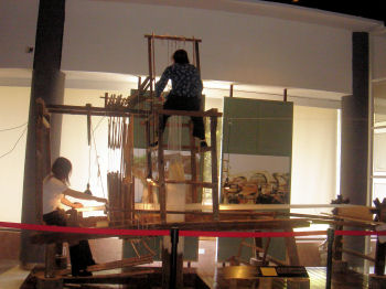 I now know more about the life cycle of the silk worm than I ever really wanted to know. I also found the historic garments interesting -- although the shoes for bound feet were rather scary. I was also fascinated by the complexity of the looms used to create the many different patterns of silk cloth. I still don't understand how they could even conceive of such devices (all made of wood) let along how they worked. Apparently they still use some of the looms for demonstrations, but they were busy making adjustments when we were there so we never saw this bad boy fired up.