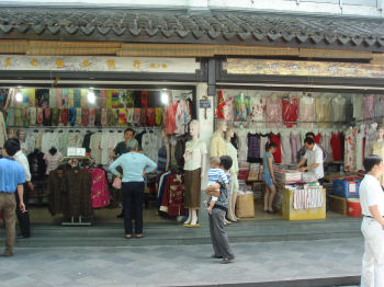 Surprise! The largest silk wholesale and retail market in China is just a block from our hotel. Having discovered this serendipitous fact, what else was there to do but go shopping? The day began and ended walking the streets of what is now called China Silk Town. Needless to say, the selections are seriously oriented toward the female shopper! If it were up to me, I would open an air-conditioned pub in the middle of the place to give the guys someplace to hang out.