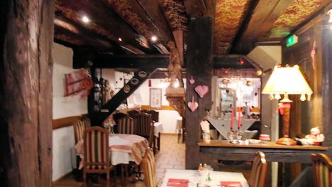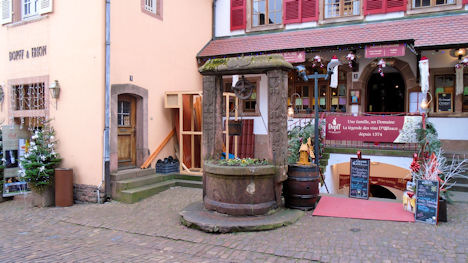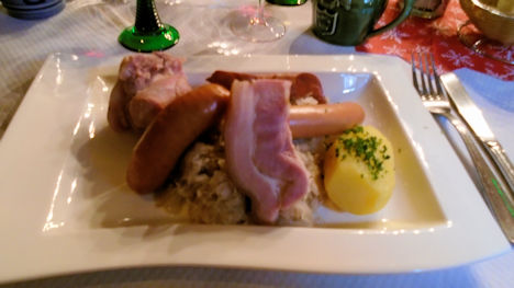 We had lunch at Manala, a restaurant/winestube tucked into a narrow street at the top of town, part of the St. Nicolaus Hotel. Margene had a creamed vegetable soup and a green salad, I went for the chacroute, a classic Alsacian dish of various meats and sausages with sauerkraut and a boiled potato.