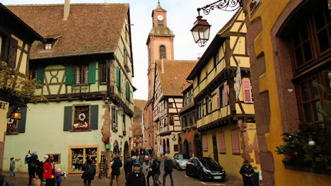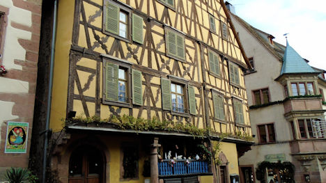 Margene wanted to visit the town of Riquewihr ("Rick-weer"), about half an hour's drive northwest of Colmar. I asked her why and she said "because it looks pretty." So we bailed the car out after a week in the parking garage -- MAJOR sticker shock! -- and headed off in search of Riquewihr. (Found it, too!) It reminded me of a scaled-down Colmar with a strong vertical component. The hills around the town are covered with grape vines, a reminder that Alsace is a big wine-producing area, primarily known for its Reisling and Gewurtztraminer wines. Pity that I'm a red wine guy (and their local reds are barely drinkable!)