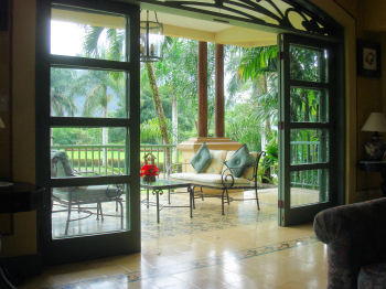 Most of our day was spent in one of these two spots. We had breakfast and lunch under the awning on the pool deck. Good thing, too, as it rained heavily while we were eating lunch. I spent most of the day on the patio with a good book, alternately watching the sun and the rain on the palms.