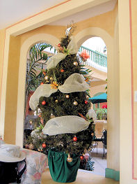 This giant mushroom is actually a huge ficus tree. Our room is the second balcony to the right of the tree. The Master Suite is a two-floor affair perched in the very top of the atrium. It always seems strange to see Christmas trees, snowmen and Santa figures in a tropical setting, but it is a Catholic country and that's what they do!