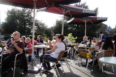 at Costa Coffee, the UK equivalent of Starbucks. The streets were packed with families enjoying the sunshine while they could