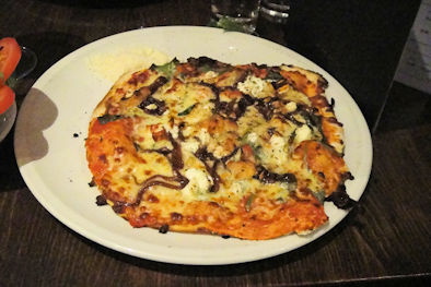 We got our pizzas, though. Margene opted for one with proscuitto, mushrooms and mozzarella. I was drawn to the combination of