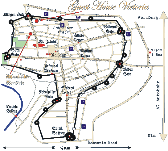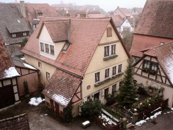 We are staying at Gastehaus Viktoria, just inside the old city wall. The shot on the right, in fact, was taken from the walkway along the top of the wall. Our room was on the top floor, the two windows in the front.