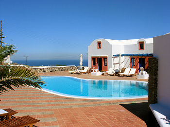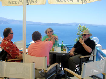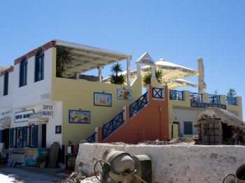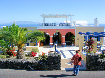 We stopped at the supermarket below the restaurant to stock up on beer, milk, coffee, bread, cheese, wine and other essentials of life and schlepped it all back down the hill to the house. The rest of the afternoon was passed relaxing on the terrace, enjoying the breeze. We anticipated an unobstruced view of the famous Santorini sunset but discovered that we were on the wrong side of the island for it. We will fix that tomorrow. We could only muster enough energy to walk across to Spiro's taverna for dinner. One of these days we will branch out and explore other restaurants ... but it won't be today!