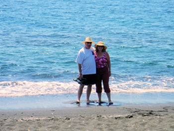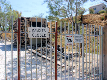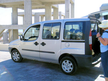 Our transportation for the day was a Fiat Doblo. It handled well and would, in fact, hold seven people comfortably ... but only if at least three of them were children! It was snug for six adults ... but I was driving and had plenty of space! We got to Akrotiri at the extreme south end of the island only to discover that it was closed. We later found out that the site is likely to be shut down for a year because of an accident where part of the roof collapsed and killed a visitor. There are accusations of poor construction, improper inspections, and the like -- the end result being a typical bureaucratic blame game that has brought everything to a screeching halt. It will probably stay that way until the various agencies pin the blame on someone. In the meantime, everyone else loses out.