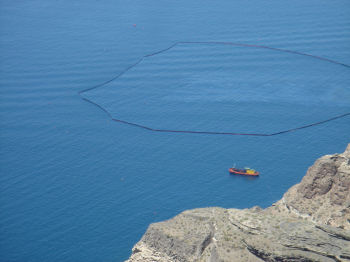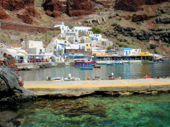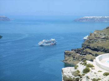 From the southern end of the caldera we had a good view of Ia in the distance. When we looked down, we were right on top of what we think is the site where the cruise ship sank a few months ago. Hard to tell for sure, but it appears that you can see it lying below the surface. It was a little creepy.