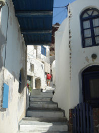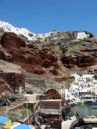 Our last stop of the day was the little fishing village of Amoudi, tucked below the town of Ia. It is a pleasant spot with a small fishing fleet, tavernas along the water, a few small lodgings ... and 277-step stairway up to Ia. The weather was far too hot for me, but Don Krump, the small red smudge on the right, headed off to walk back to the house. We beat him home, but not by all that much.