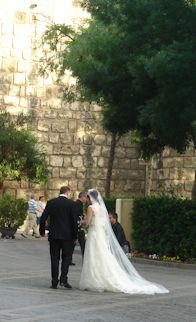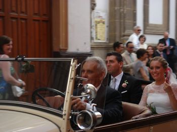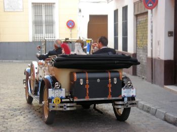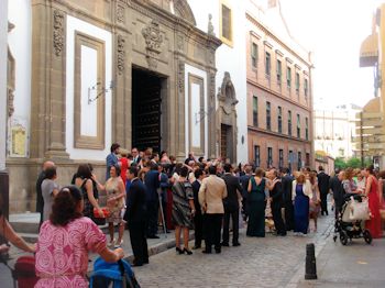 Then it was back to the cool air of our room for a siesta, also a very civilized idea. Around 7pm we wandered out again. Around the corner we ran into the first of several weddings we saw tonight. The car is a 1928 Model A Ford touring car, one of two matched vehicles outside the church. It was a gorgeous automobile. A block or two down, the street opened up to a tree-lined few blocks lined with bars, restaurants and shops, ending at the Cathedral of Seville and the Alcazar, a 10th century palace. We plan to see more of it tomorrow afternoon after the tourist groups have left. We did run into another round of wedding photos outside its walls, though.