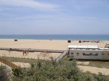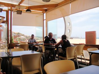 We drove a few miles west to Portimao, one of the largest beaches on this part of the coast. A boardwalk dotted with restaurants runs the length of the beach and seemed like a good spot to find a light meal. It was. We split a small (tasty if uninspired) pizza. A bit of shade, a cold beer and life was good. The logistics of running a place like this have to be challenging. It appears that everything has to be lugged down the hill and across the boardwalk on a hand truck!