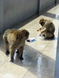 The top of the rock is home to the legendary Barbary Apes. They are wild critters with a well-developed ability to snatch what they fancy from unsuspecting tourists. We were advised not to leave bags unzipped or EVER pull out food or a plastic bag. The apes associate plastic bags with goodies and they will wrestle them away from you in the blink of an eye. We saw it happen twice and in both cases the tourists were caught off guard. The only safe thing to do is drop the goodies and step away.