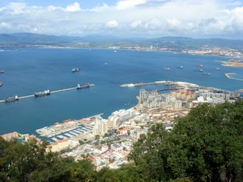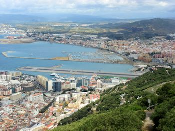 The views were spectacular from the top, though. A little hazy looking across to Africa but clear enough to see how the town of Gibraltar (actually an independent country owned by Britain) is tucked into this tiny peninsula. Across the center of the last photo you can make out the airport runway. That crosses the only road into and out of Gibraltar and traffic flow stops completely for 10-15 minutes every time a plane is landing or taking off ... but more on that in a minute.