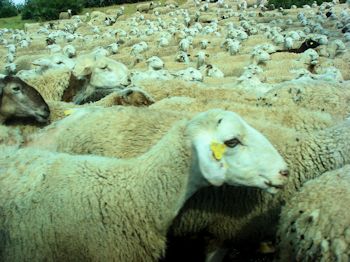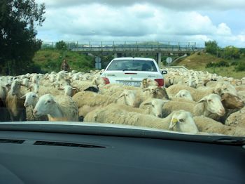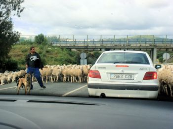 The trip was pretty routine until the car in front of us suddenly braked to a stop. In a moment it became apparent why ... and that why kept getting bigger and more spread out until both our cars and the car behind me were small islands in a sea of sheep (led by a couple of goats, I might add). It probably took five minutes before the last of the herd was across the road and headed up the hill. I wonder if my auto insurance covers dents from sheep ...