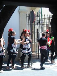 They were cleaning our room when we arrived, so we walked 50 feet to Garum 2.1, a self-described bistronomic tapas bar, for some pichos of the acorn-fed Iberian ham we have come to love and a frosty beverage. Both were excellent and very welcome! But through the grate on the front window, we started noticing boisterous groups of (mainly) young people in costumes of some sort and started wondering what was going on.
