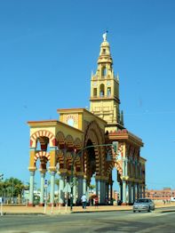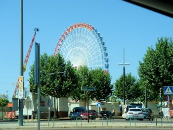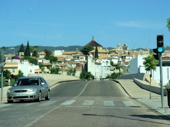 The run to Cordoba was smooth but without much to recommend it, scenery-wise. As we arrived in Cordoba we saw a huge ferris wheel and an ornate gate of some sort ... although it didn't appear to be a gate to anything in particular. There were lots of people walking around but we didn't figure all of that out until later. Our trusty GPS brought us into town about noon ... not to be confused with directing us to our hotel. In fact, Gertie (the GPS has a female voice) directed us across the river to the old section of town, then left on a dead-end street. She wanted us to take a right at the end and double back on the street above ... but there was a problem.