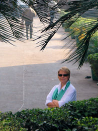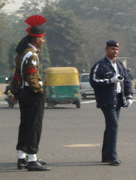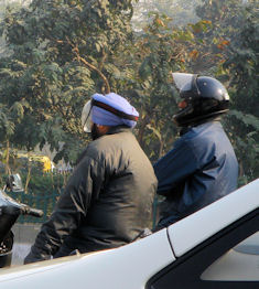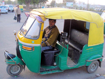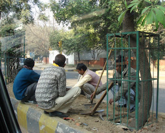 Traffic is generally congested in Delhi and moves at a slow crawl ... except during the morning and afternoon rush periods when it simply stops moving entirely! The traffic moves in a similar manner to what we saw in China -- basically everyone on the road trying to occupy the same piece of pavement at the same time. Scooters and motorcyles are everywhere, continually honking their horns. Three and four on a bike is not unusual and we have seen five! I will admit that the turban with a face shield was a new one for me, though. "Hunkering" -- essentially sitting on your heels -- seems to be the position of choice throughout Asia. They can sit like this all day. (Their knees are obviously in better shape than mine!) The ubiquitous auto-rickshaws buzz about like angry bees. They run on compressed natural gas (a good thing) but still make a gawdawful rattling noise that nearly deafened us during our short ride in one.