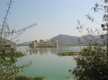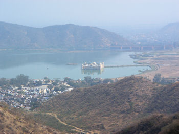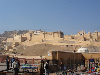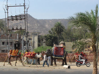 Also on the tour today was the Amber Palace, an amazing structure situated along the pass that invading armies always took when moving on Jaipur. By the time we got up here Margene was not feeling well, so we opted not to make the climb up to the palace itself. I am told that you can ride an elephant up to the palace but we didn't see any around ... at least there. When we got down to the Lake Palace, there were decked-out camels and elephants just across the road, although for what purpose I don't know. The water level in the lake is quite low now, the result of continued drought conditions in this largely arid part of India.