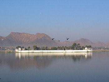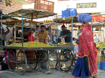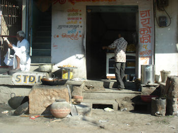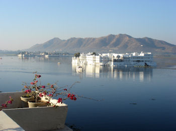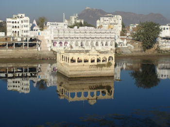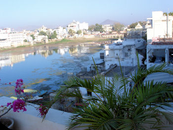 The focal point of Udaipur is Lake Pichola and the Lake Palace, probably the most-photographed hotel in India. Behind it is the larger Jag Mandir, once a refuge for Shah Jawan, builder of the Taj Mahal but better known recently as the location for the James Bond movie, Octopussy. Some places in town show that film every night! The area suffers from unreliable rainfall and you can see that the water level in the lake is probably down twenty feet. From time to time the lake goes completely dry and the Lake Palace sits in the middle of a huge green field -- pretty, but nowhere near as spectacular. I am told that construction is underway on a channel from the hills to provide a consistent water source for the lake ... and that would be a good thing.
