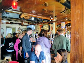 By 12:30 there was quite a crowd milling around the car park in front of Bulman. Fortunately it was a delicious early spring day -- quite pleasant in the sun and chilly in the shade, so most people seemed to be enjoying the wait. Once the doors opened, though, there was a rush to get inside and claim a seat. It didn't take long before all the seats were taken and the crowd was two and three deep at the bar.