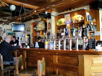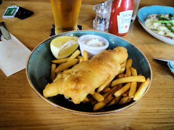 The Bulman was a lot quieter today. It has a nice homey feel to it -- a little nicer than just a pub but more comfortable than a restaurant. I never got upstairs to see how they did the actual restaurant portion of the place. Maybe on the next trip. I always believe that decor should give you something interesting to look at no matter where your eyes are pointed. The Bulman has done that by adding raised nautical elements to an otherwise glossy flat ceiling. There are several necessary fixtures (smoke detector, etc.) neatly tucked into the raised sextant. Other parts of the ceiling have a flock of seagulls and various other images -- enough to keep it interesting without looking cluttered. For lunch, Margene had her gnocci again (awesome!) and I went for the fish and chips. The portion was huge, although for 14.50 euros (about $20) I'd hope so. It, too, was as good as I've had anywhere.
