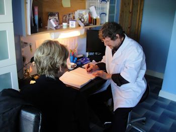 Patrick Tiedt is a delightful Irishman. He's not only a holistic sort of chiropractor but he is a certified acupuncturist trained in China. His practice combines the two disciplines in what Margene said was a very effective way. He started with acupuncture to relax her muscles, adding a low electric charge to the needles. I hadn't seen that done before. Then it was on to the chiropractic part of the treatment, but without any forced manipulation.