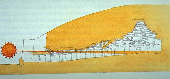 solstice, December 21, a ray of light enters through the roofbox (the opening above the entry), creeps slowly down the