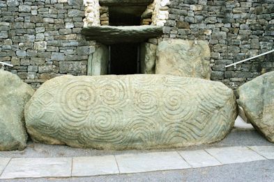 primary kerbstone to enter the passageway. The spiral and geometric decorations are seen carved into stones both inside