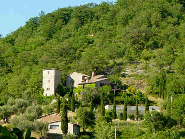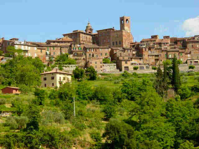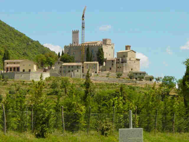 The mysterious castle turns out to be Castello Antognolla, now owned by Prada, the famous Milan fashion house, who is developing it as a new resort property. The golf course is just behind the fence. On the right, a postcard scene from the town of Corciano.