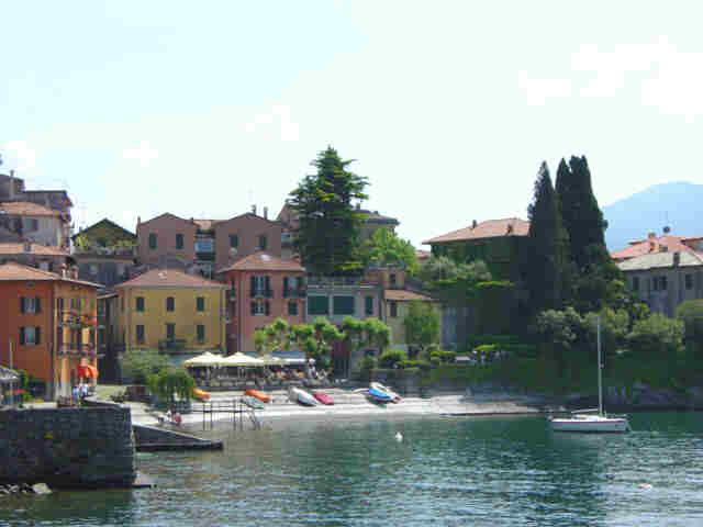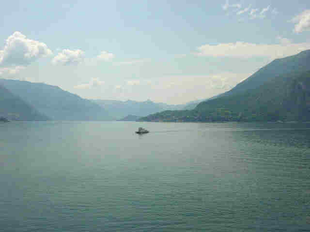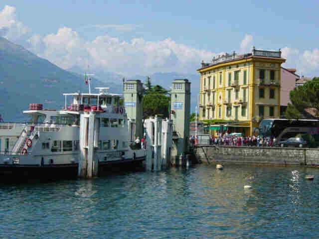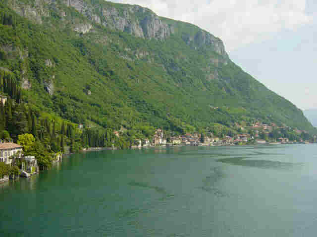 The three major lakes north of Milan are Maggiore, Lugano (which is actually in Switzerland) and Como. The last time we were up this way, we stayed above Lake Maggiore. These are glacial in origin and as you can see, the mountains come right down to water level. Lake Como is the most developed of the three in that there are many towns around its shores. There is an extensive network of car and people ferries connecting the towns. The lake is shaped like an upside-down Y with Como and Lecco the largest towns at the bottom of each leg. Bellagio is the town at the center point. Slightly to the north, the principle town on the western shore is Mennagio and on the eastern shore, Varenna where we are staying.