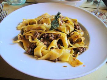 Lunch was at Osteria La Porta, just inside the main gate (la porta) to the town. In addition to Giacomo's recommendation, TripAdvisor had all rave reviews on this little spot. Daria, the ever-present owner, is a friend of Giacomo's and her English, like his, is quite good. We can get along reasonably well with menu Italian but it was nice to have a little higher level of communication. Margene went for a ravioli filled with spinach and ricotta. I opted for pappardelle (wide noodles) with wild boar sauce. Both dishes were awesome ... enough so that Margene decided we would be coming back for lunch tomorrow! No argument from me ... even if it means we have to pass on the spinach gnocchi at Trattoria La Grotta in Cortona.