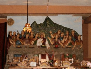 Dinner tonight was at the Inka Wasi Restaurant, one of dozens of local pizzerias. The interior was exceptionally well-done with several fireplaces blazing, including a wood-fired pizza oven. At one end of one of the dining rooms, was a full-relief of the last supper ... except that it was Jesus with the 14 Inca kings.