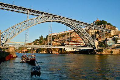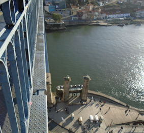photographed is the double-decked Dom Luis Bridge. The top deck is a railroad and pedestrian crossing. The lower level is