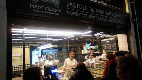The first stop was the Time Out market, a couple of blocks away. We expected an all-purpose shopping mall. Instead we walked into the most expansive food hall I have ever seen. There are 30-40 vendors in small stalls all around the main floor offering all sorts of food and drink. As you can see, the joint was packed! Alas, the seating was all high stools at long tables which Margene knew she'd never be able to get up on, even assuming we could find an empty seat. So we picked up a few of the famous pasteis de nata custard pastries at a stall that makes them on site and cranks them out by the thousands and went looking elsewhere for the items on our list.