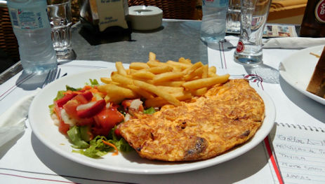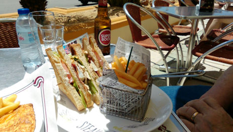 It was too nice a day to eat inside and the outdoor umbrellas of Busiris beckoned. We kept it simple as we usually do -- an omelette for Margene, a club sandwich and a beer for me. Turns out that was our "big" meal of the day. We've got munchies at the apartment that filled in the blanks later in the evening.