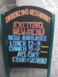 Do you get excited when you see this first sign? When I saw it on the street outside Brooklyn's Restaurant, what struck me was that their "exciting new menu" ... wasn't ... at least to anyone but themselves. It seems to me that when you have to make a sales pitch to have others think that something is exciting, you have failed to address their needs. In contrast, when others get excited about what you have done ... THEN you have nailed it and there isn't much more that needs be said.